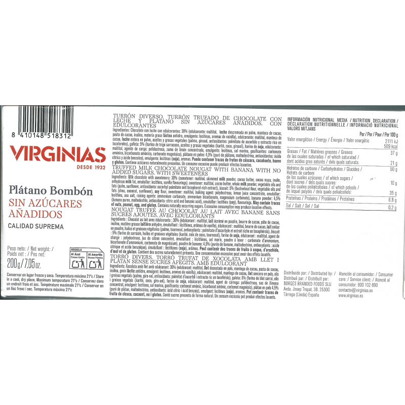 Ingredients: White coating without added sugars (maltitol, cocoa butter, whole milk powder, soy lecithin, and natural aroma of vanilla), chocolate coverage without added sugars (maltitol, cocoa butter, whole milk powder, cocoa paste, soy lecithin and natural vain aroma), banana paste.