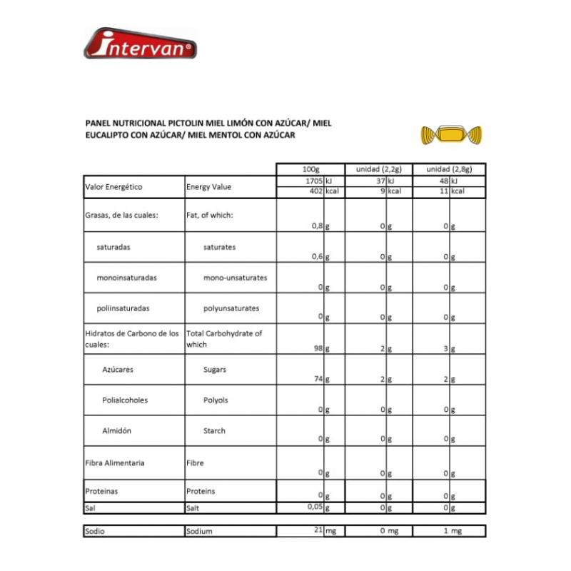Ingredientes:Azúcar, jarabe de glucosa, miel (9%), aroma de limón.