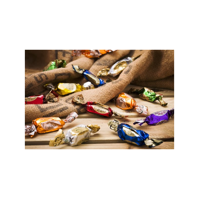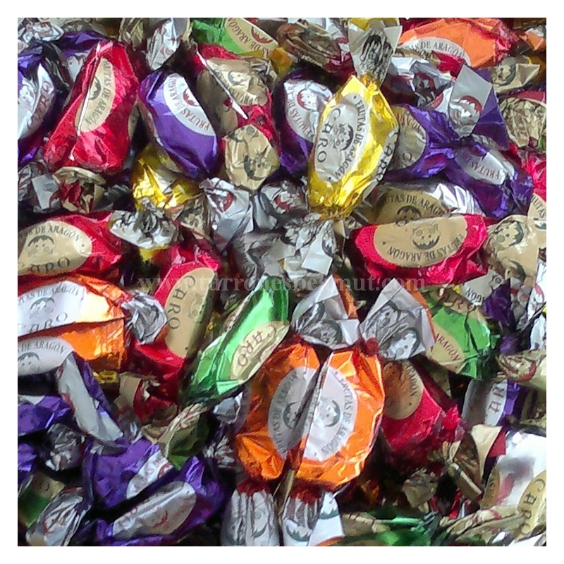 Fruits confits (fruits, sucre, sirop de glucose, conservateurs E-202, E-211 et E-223, correcteur d'acidité: acide citrique et saveur) et enrobage de chocolat (sucre, pâte de cacao, beurre de cacao, émulsifiant: lécithine le soja et le goût: vanilline).