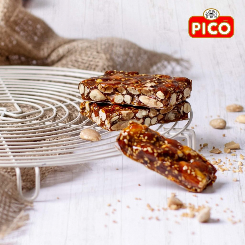 Amandes grillées (60%), sucre, miel, sirop de glucose, de graines de sésame (5%) et la tranche (l'amidon de pomme de terre et de la lécithine de tournesol - émulsifiant E-322). Traces possibles: blanc d'oeuf.