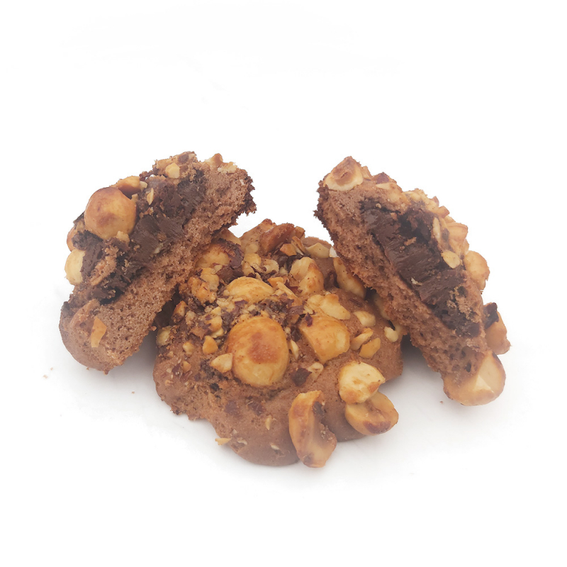 Ingrédients: Crème de cacao 25% (sucre, huile végétale, cacao dégraissé en poudre, amidon modifié, graisse végétale, émulsifiant: (lécithine de soja), pâte d'avoine, arôme et arôme de vanilline), farine de blé, sucre, margarine végétale, huiles et graisses végétales (palme, coco et tournesol), eau, émulsifiant E471, lécithines, sel (0,4%), acidifiant (acide critique) et arômes), œuf entier pasteurisé, noisettes 6,60%, chips de chocolat (sucre, beurre de cacao, lait écrémé en poudre, pâte de cacao, dextrose, émulsifiant E322 et arôme), peau d'orange (peau d'orange, sucre, glucose, conservateur E202, et arôme), en poudre de cacao. Beurre (contient du lait) arômes et vanille.