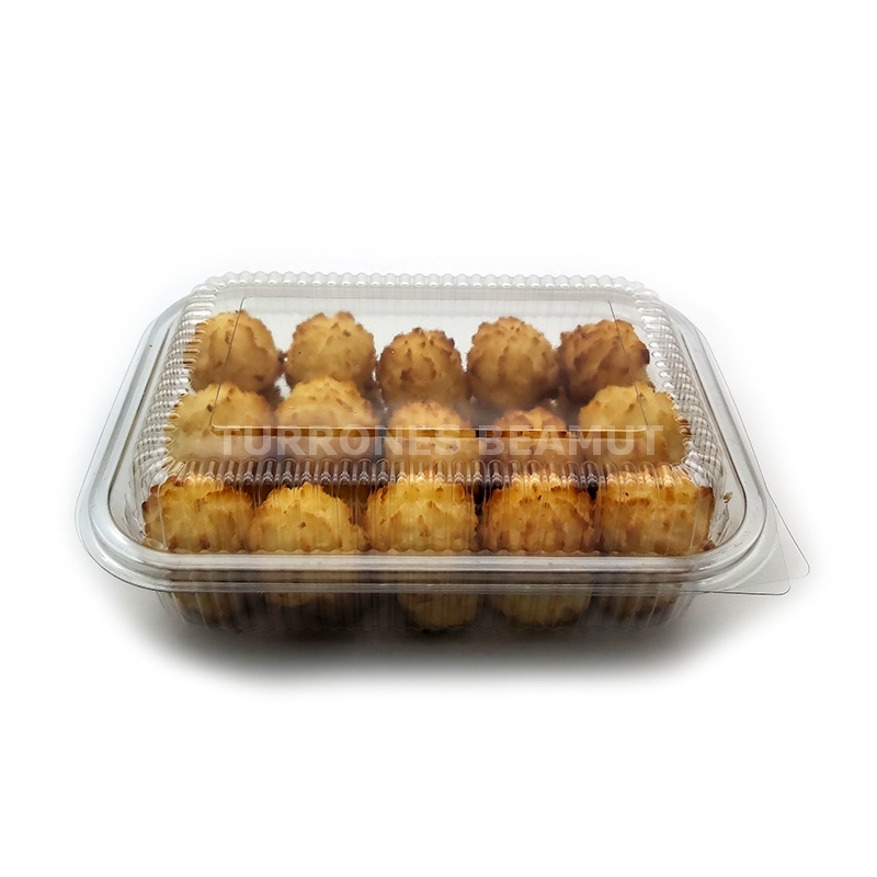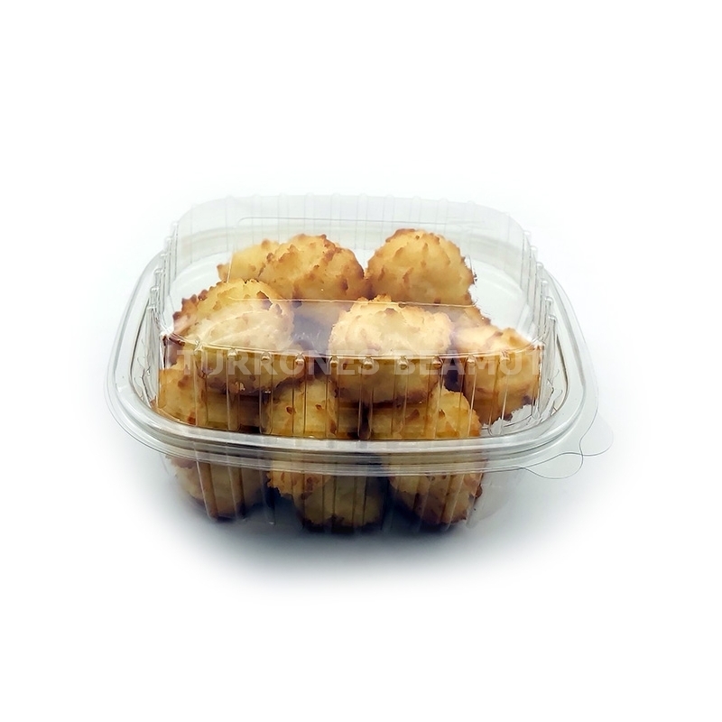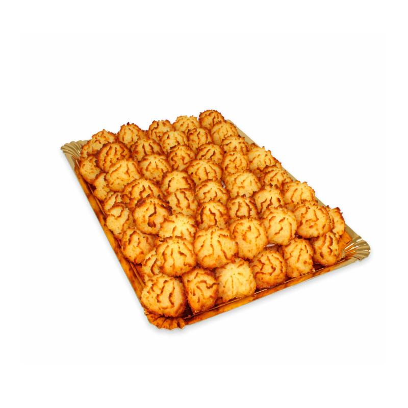 Noix de coco râpée, sucre, oeuf, cheveux d’ange, eau, flocons de pommes de terre, crème de vanille, sucre inversé, hydratant, conservateur, acidulant et arôme.