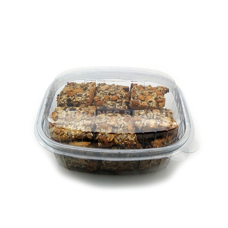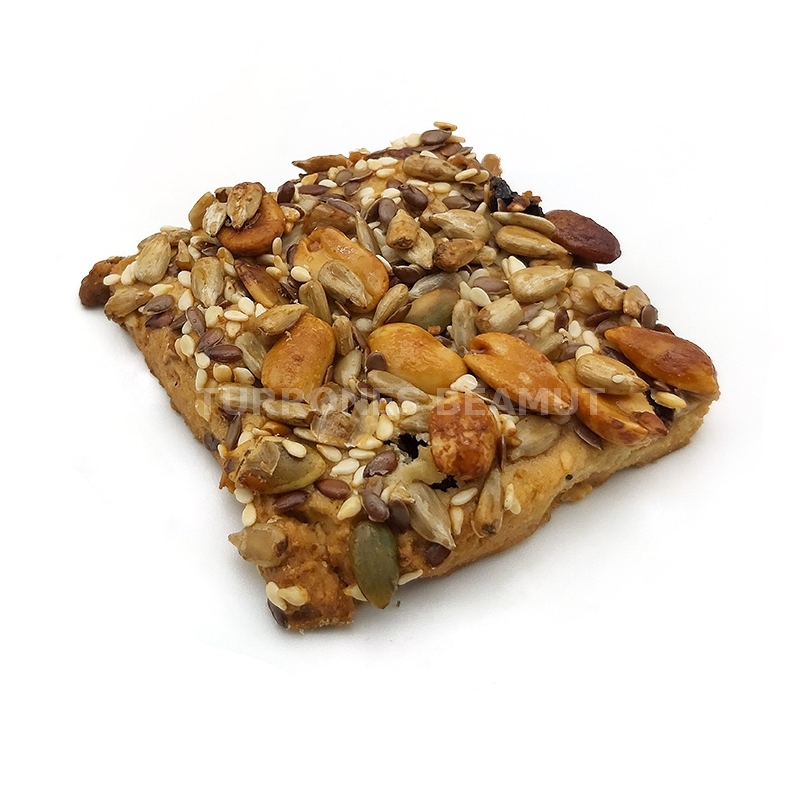 Farine de blé, margarine végétale [huile végétale, eau, émulsifiants (E471, E322), sel, teinture; E160a, arôme], sucre, arachides, graines de tournesol, raisins secs, sucre inversé, [Sucre, eau, régulateur de l’acidité: acide citrique, E500], graines de lin, grains de sésame, glucose et sirop de fructose, graines de citrouille, arôme, hélice: E500, et amidon de maïs.
