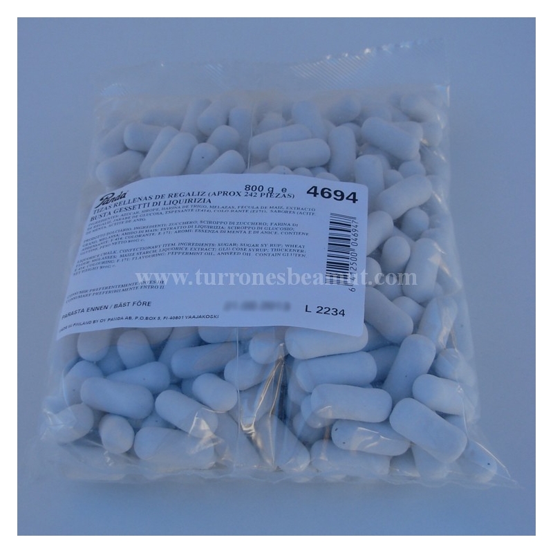 Sucre, sirop, farine de blé, mélasse, fécule de maïs, extrait de régalis, sirop de glucose, épais (E414), colorant (E-171), saveurs (huile de menthe, huile d'anis).
