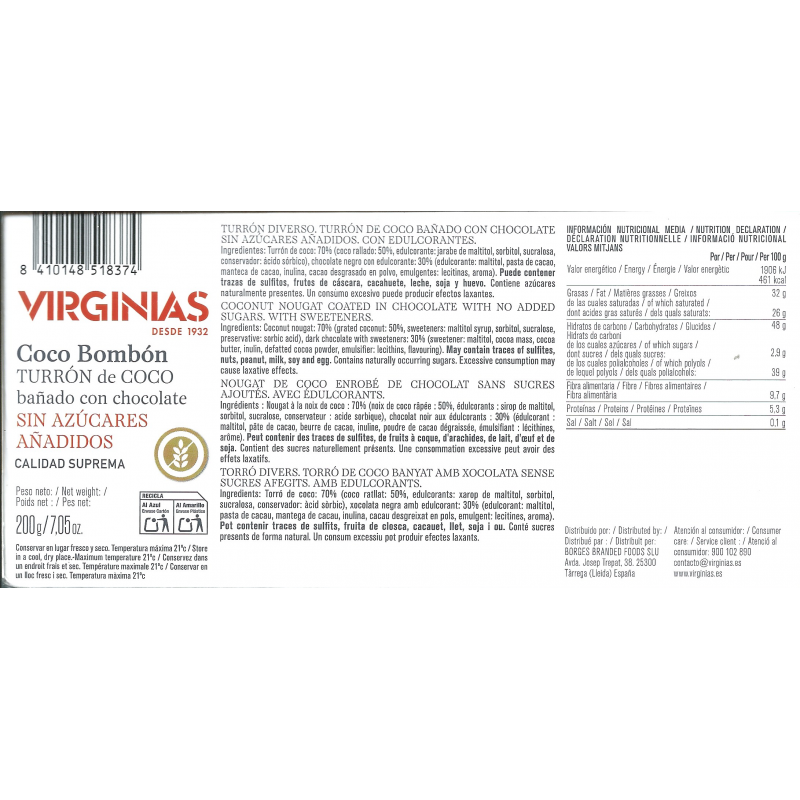Nougat de noix de coco au chocolat sans sucres ajoutés "Virginias" 200 gr.